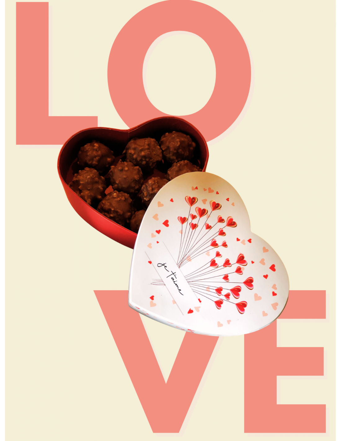Coffret spécial saint valentin garnie de petit rocher praliné noisette caramélisée. Un cadeau gourmand et un grand classique de la maison.