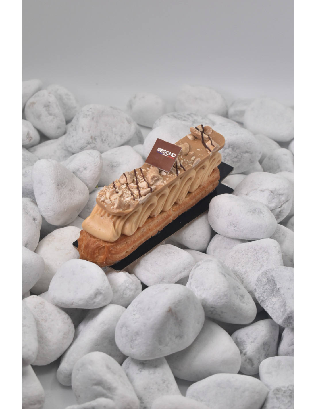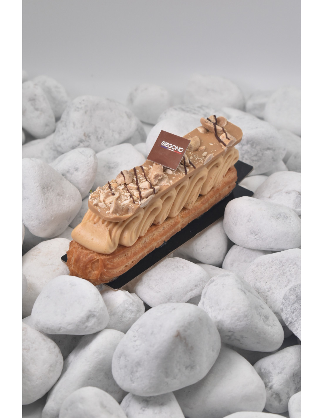 Pâte à choux garnie d'une crème légère, praliné au concassé de cacahuètes et caramel fleur de sel