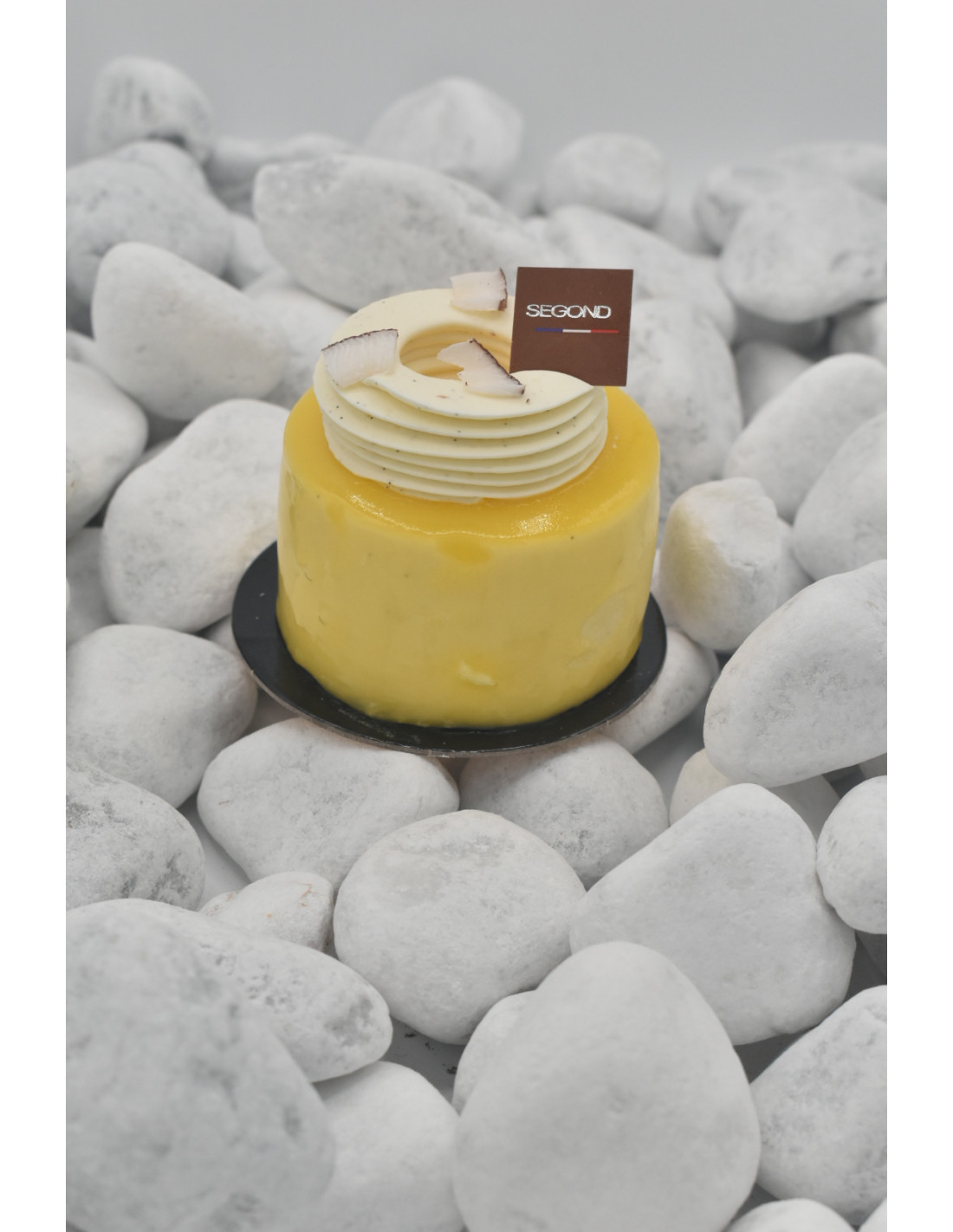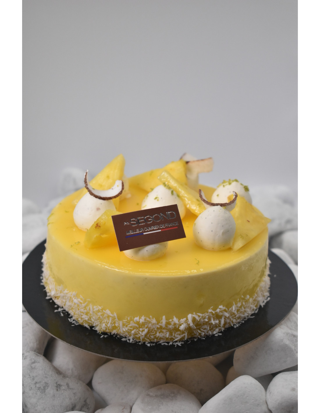 Sur un crunch coco, et chocolat au lait, un biscuit madeleine et citron vert, une compotée mangue et ananas.