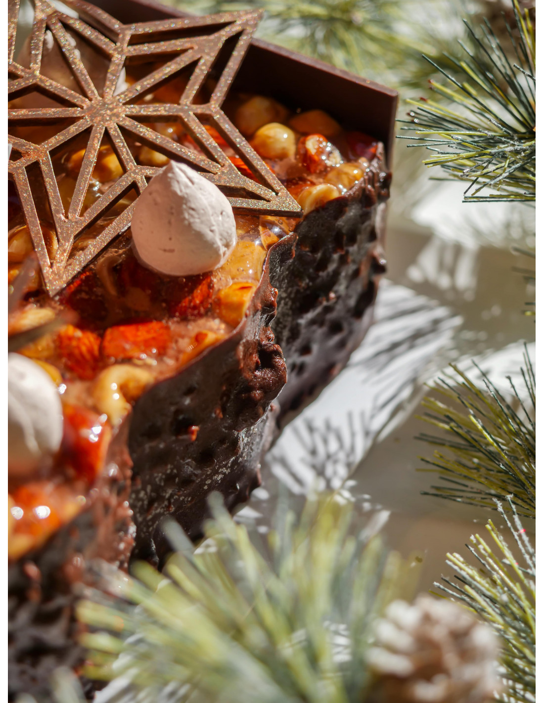 Biscuit au cacao, crème glacée chocolat noir grand cru, crème glacée praliné, concassé de noisettes sablées et caramélisées.
