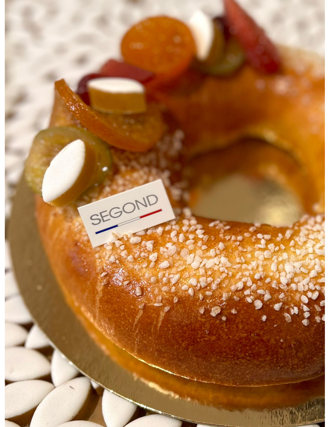 Gâteau des rois présenté dans sa belle boite de transport, avec sa couronne majestueuse, sa fève traditionnelle et son sujet.