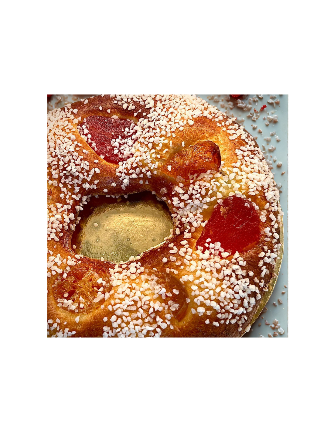 Brioche très moelleuse fourrée d'une crème d'amande de noisette maison et sertie de fruits confits d'Apt.
